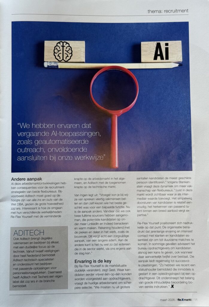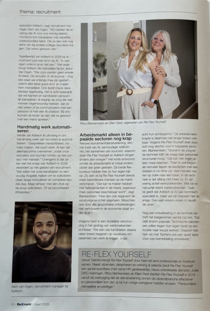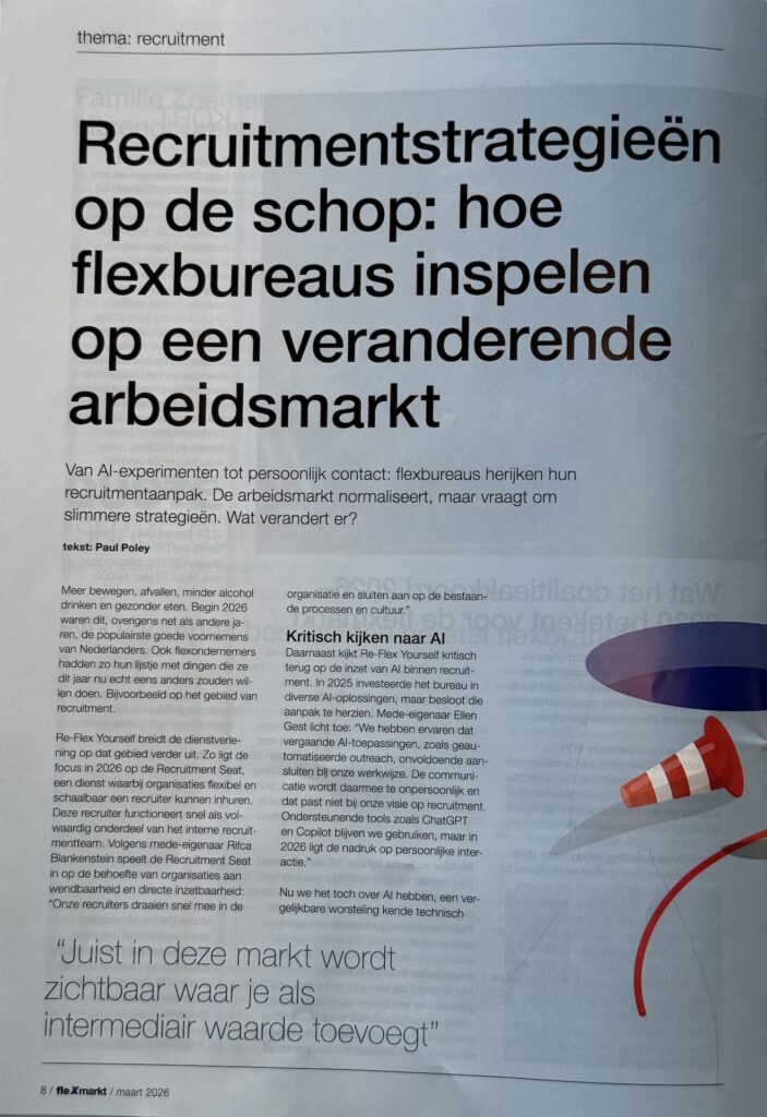 Re-Flex Yourself staat in het vakblad Flexmarkt! ✨ In dit artikel delen Rifca en Ellen hun visie op recruitment in een veranderende arbeidsmarkt. Nieuwsgierig naar het hele verhaal? Het volledige artikel lees je hieronder.